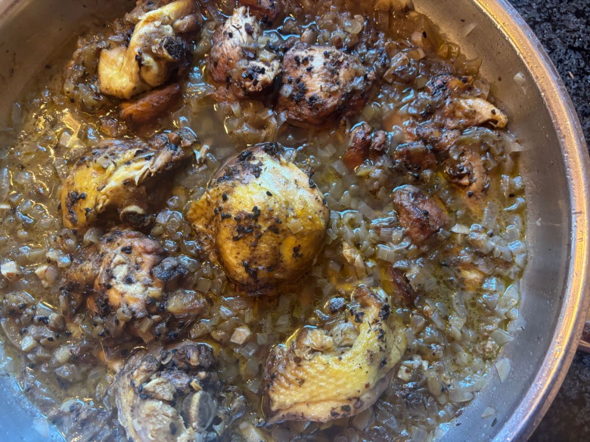 In einer großen Pfanne oder Tajine 3-4 EL Olivenöl erhitzen und die Hähnchenstücke darin auf beiden Seiten goldbraun anbraten.