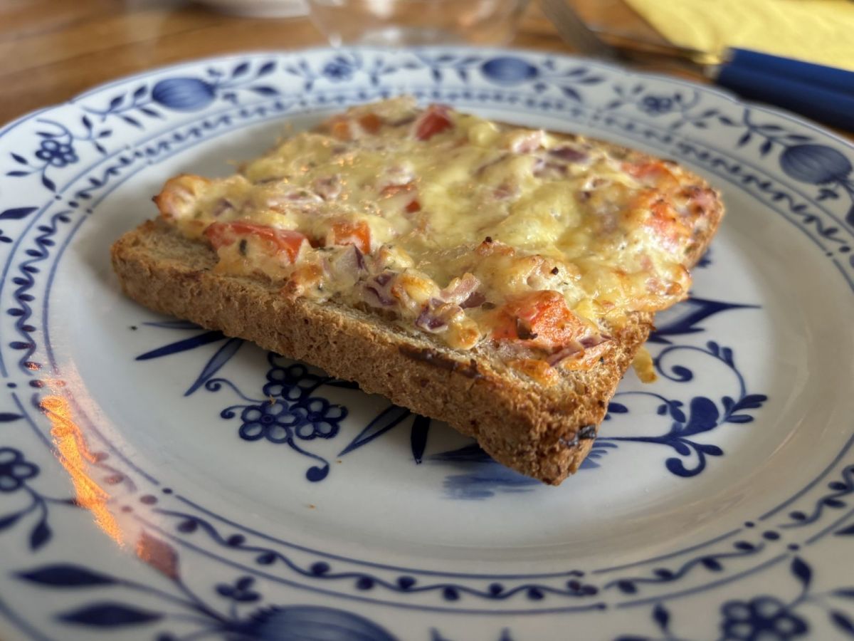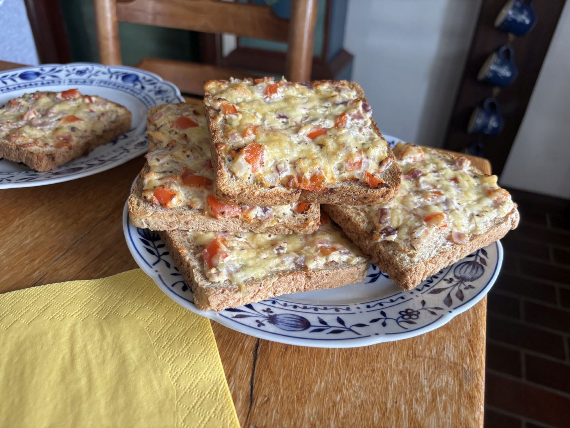 Er rührte eine Aufstreichmasse aus Schmand, Schnittlauch, Dill, Paprikastückchen, Kochschinken, Zwiebeln, geriebenem Käse, SalzundPfeffer, Paprikapulver und weiteren nicht näher definierten und variablen Zutaten aus dem Morsumer Gewürzregel zusammen, bestrich den gesunden Vollkorntoast damit und stellte das Blech für 12-14 Minuten in die 180o Umluft.