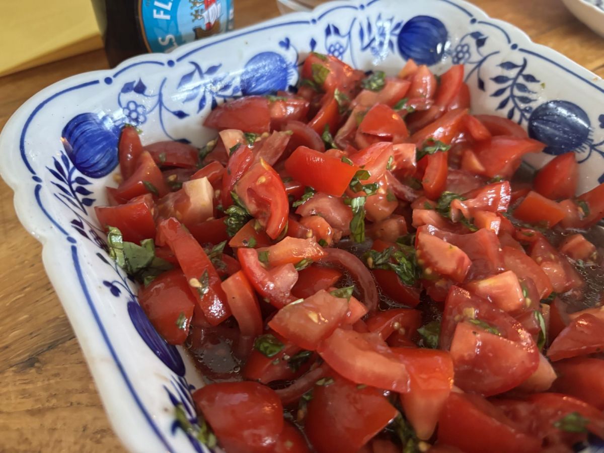 Der Toast war kross, der zusätzlich aufgestreute Käse schön geschmolzen, der Belag hat toll geschmeckt und Tomatensalat dazu war super.
